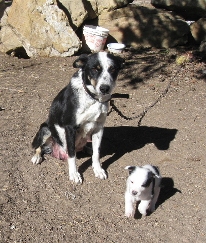 This is a good cross with plenty of grit from the Aussie side and the intelligence of both. Bella will follow hand and voice commands. She is also a good watch dog, telling me when strangers approach, without barking incessantly. She is quiet around the house and very affectionate. She is a good working dog, but we must say her first love is WATER. Of any kind or size. If you want a dog predisposed to enjoy water activites, consider one of her pups. Please note: Bella and Slick are from two different registries, pups may not be registerable.